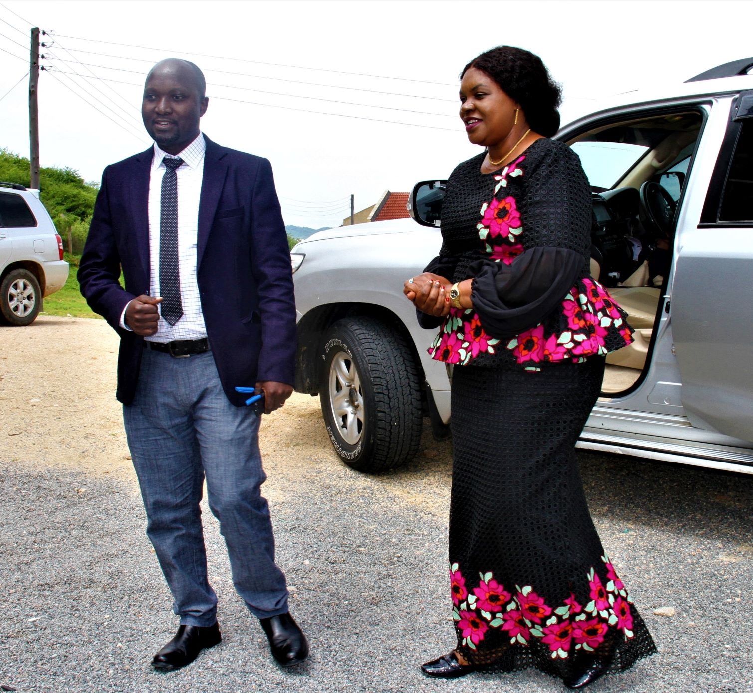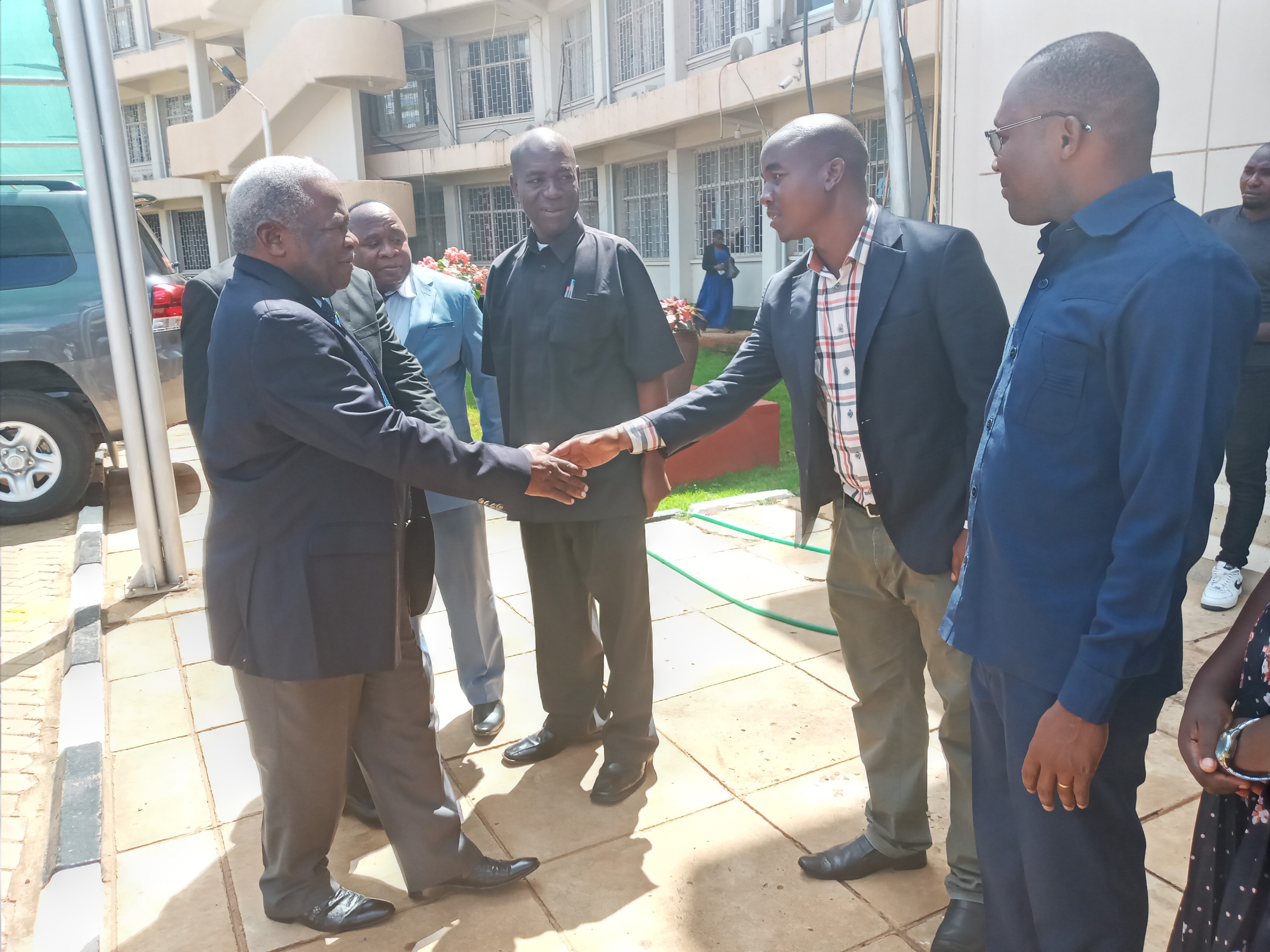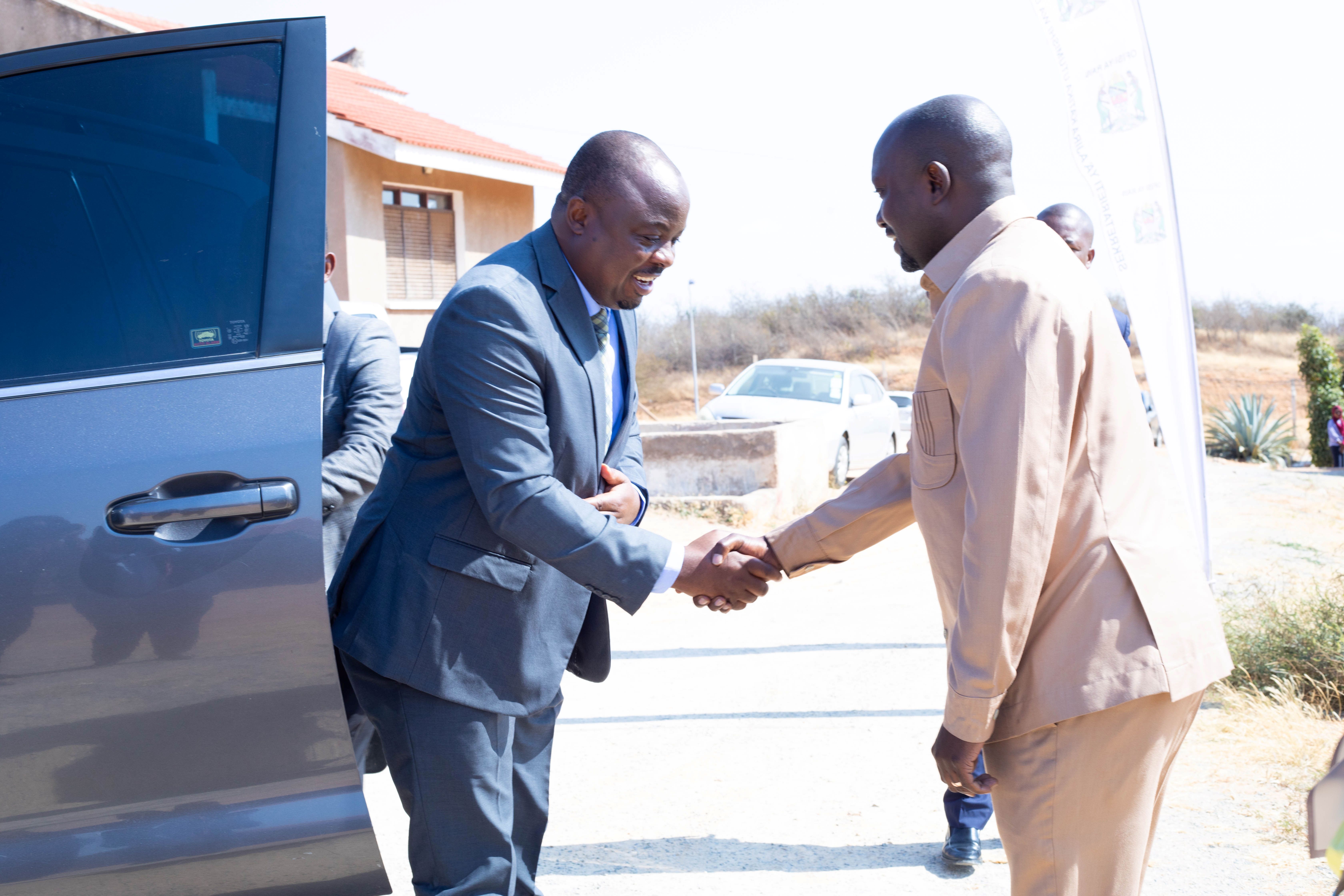 Naibu Waziri wa Nchi, Ofisi ya Rais, Menejimenti ya Utumishi wa Umma na Utawala Bora, Mhe. Deus Clement Sangu akisalimiana na Kaimu Katibu Msaidizi Idara ya Ajira alipotembelea ofisi hizo jijini Dodoma