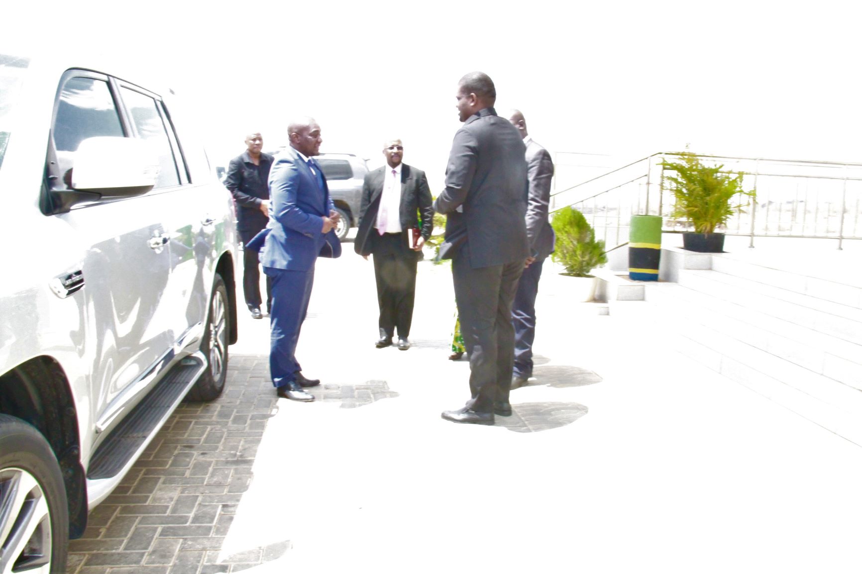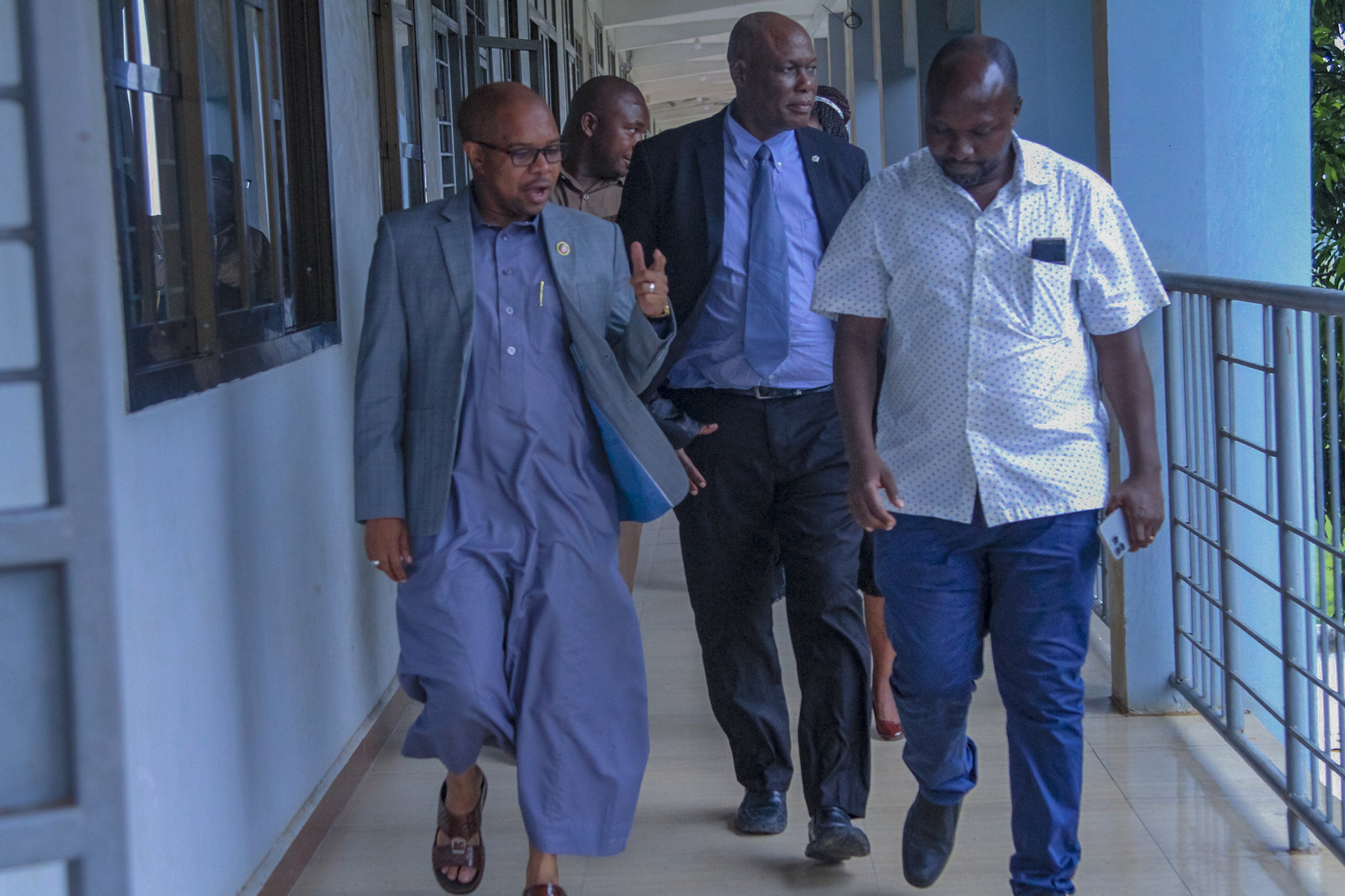 Katibu Mkuu, (OR-MUUB), Dkt. Laurian Ndumbaro akiingia katika ofisi za Sekretarieti ya Ajira eneo la Mazizini-Zanzibar, nyuma yake ni Katibu wa Ofisi hiyo Bw. Xavier Daudi na Mkurugenzi wa Mipango na Rasilimaliwatu (OR-UUUB) Bw Khamis Juma.