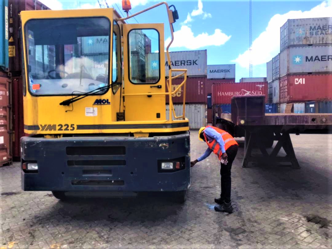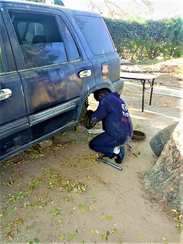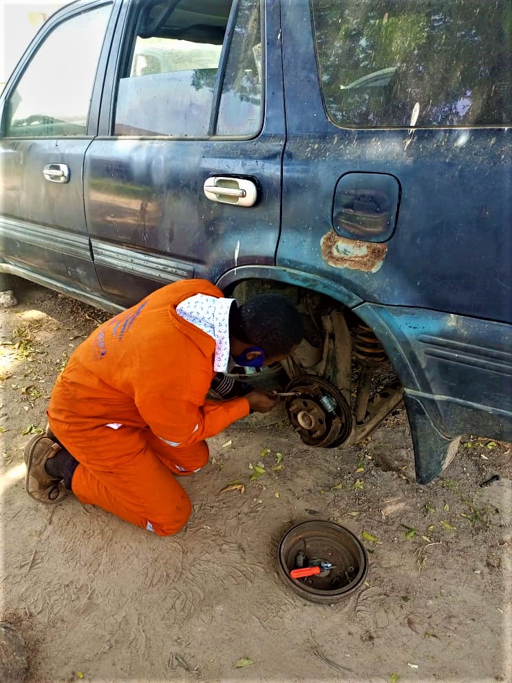 Mmoja wa vijana wa ufundi VETA akifungua ili kukirekebisha kifaa cha gari wakati wa usaili wa vitendo.