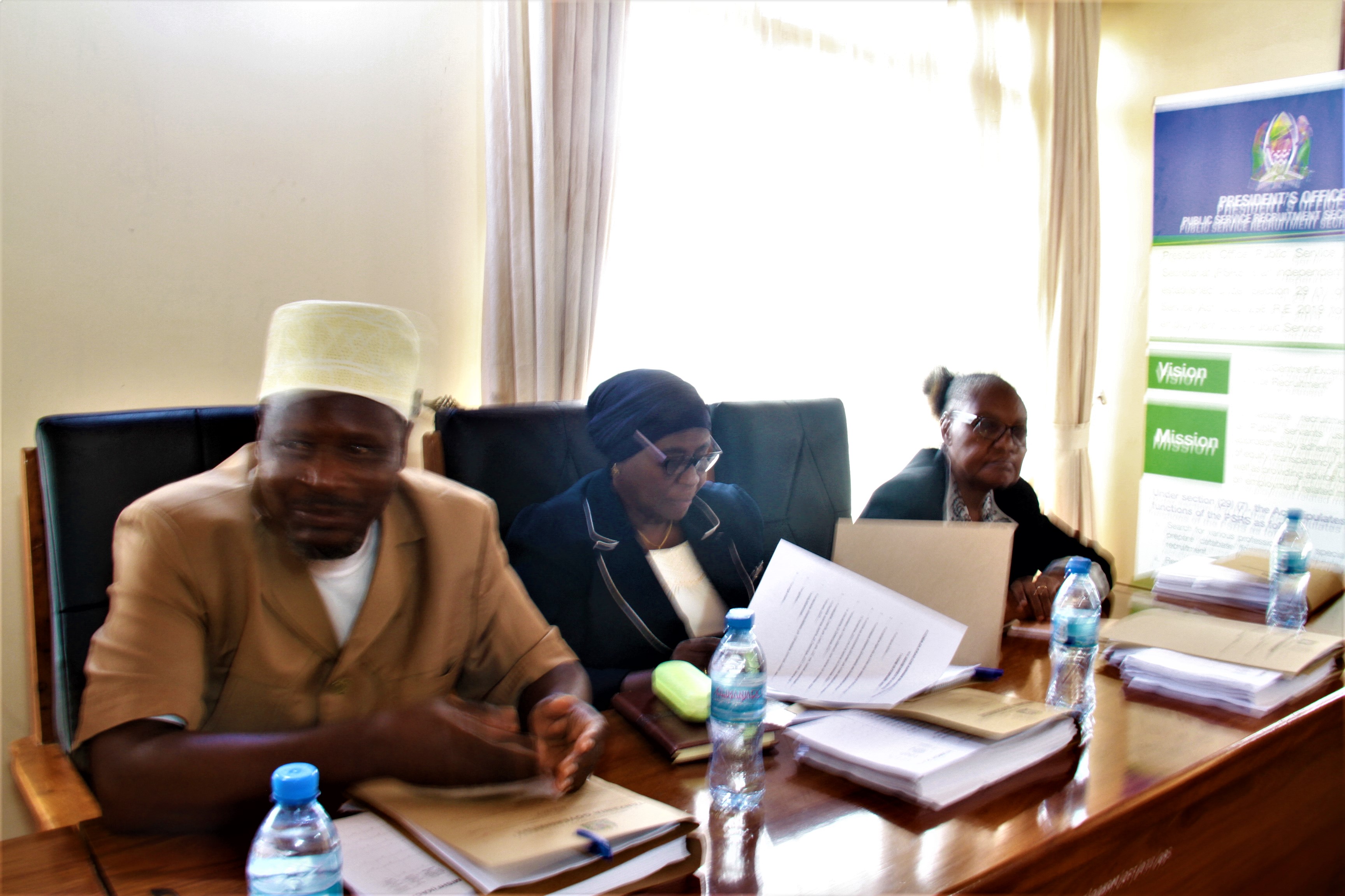Naibu Katibu Idara ya Ajira katika Sekretarieti ya Ajira Bw. Lucas Mrumapili akiwasilisha taarifa ya usaili uliopita mbele ya Wajumbe hawako pichani, kushoto ni Katibu Msaidizi Bi Khadija Isihaka na Mkurugenzi wa Utawala na Rasilimali watu Bi. Victoria Fovo.