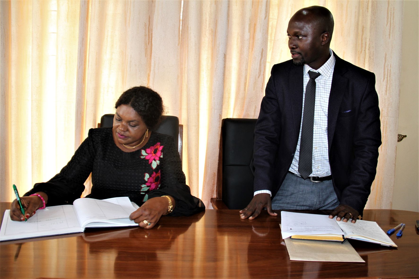 Katibu Mkuu, (OR-MUUB), Dkt. Laurian Ndumbaro akisaini kitabu cha wageni katika ofisi za Sekretarieti ya Ajira, Mazizini-Zanzibar.