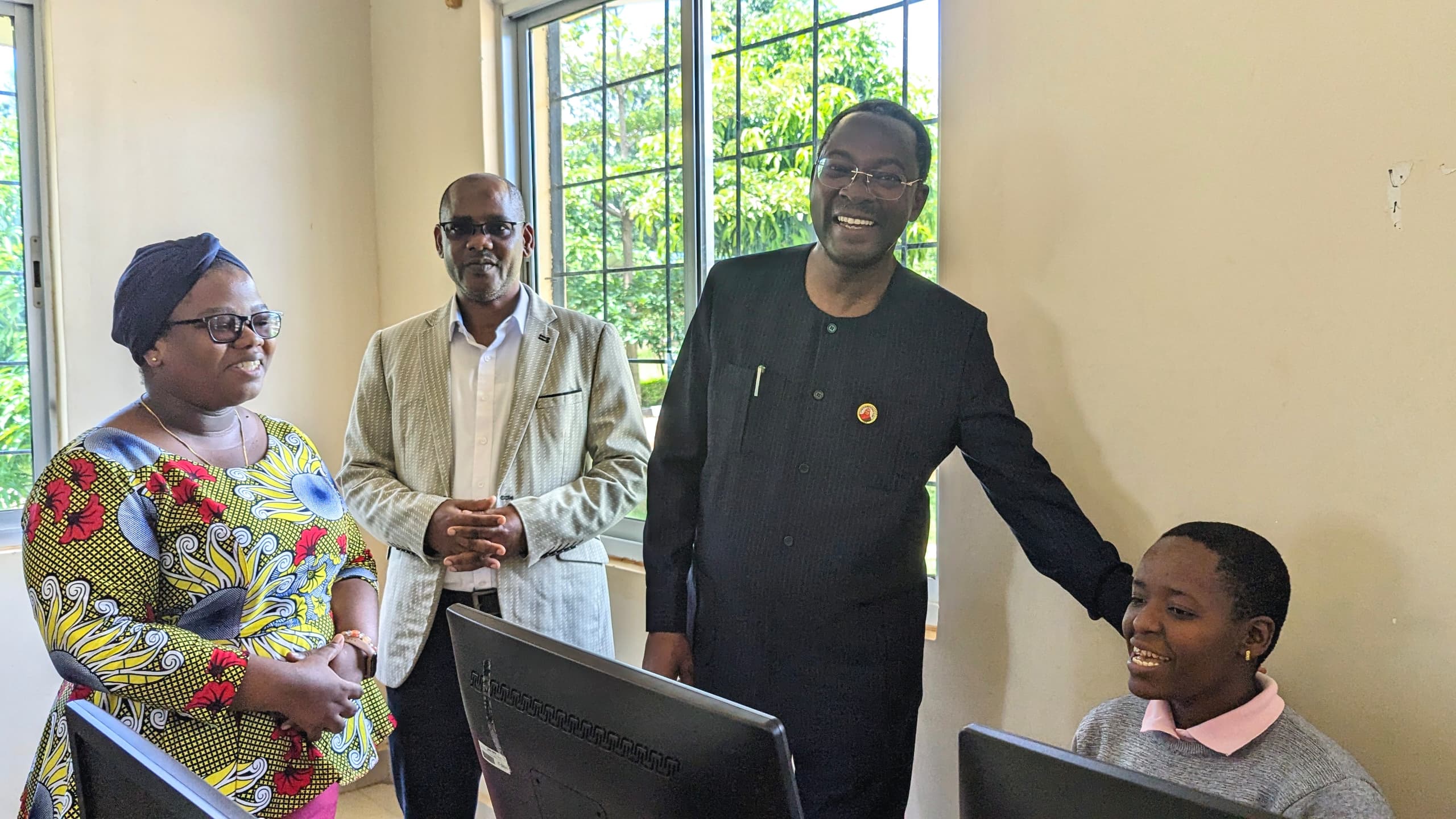 Waziri wa Nchi Ofisi ya Rais Menejimenti ya Utumishi wa Umma na Utawala Bora Mhe. George Simbachawene pamoja na Kaimu Katibu Sekretarieti ya Ajira katika Utumishi wa Umma Bw. Innocent Bomani wakiwa kwenye chumba cha kufanyia usaili wa kuandika kwa njia ya Kidigitali katika kituo cha VETA Manyara