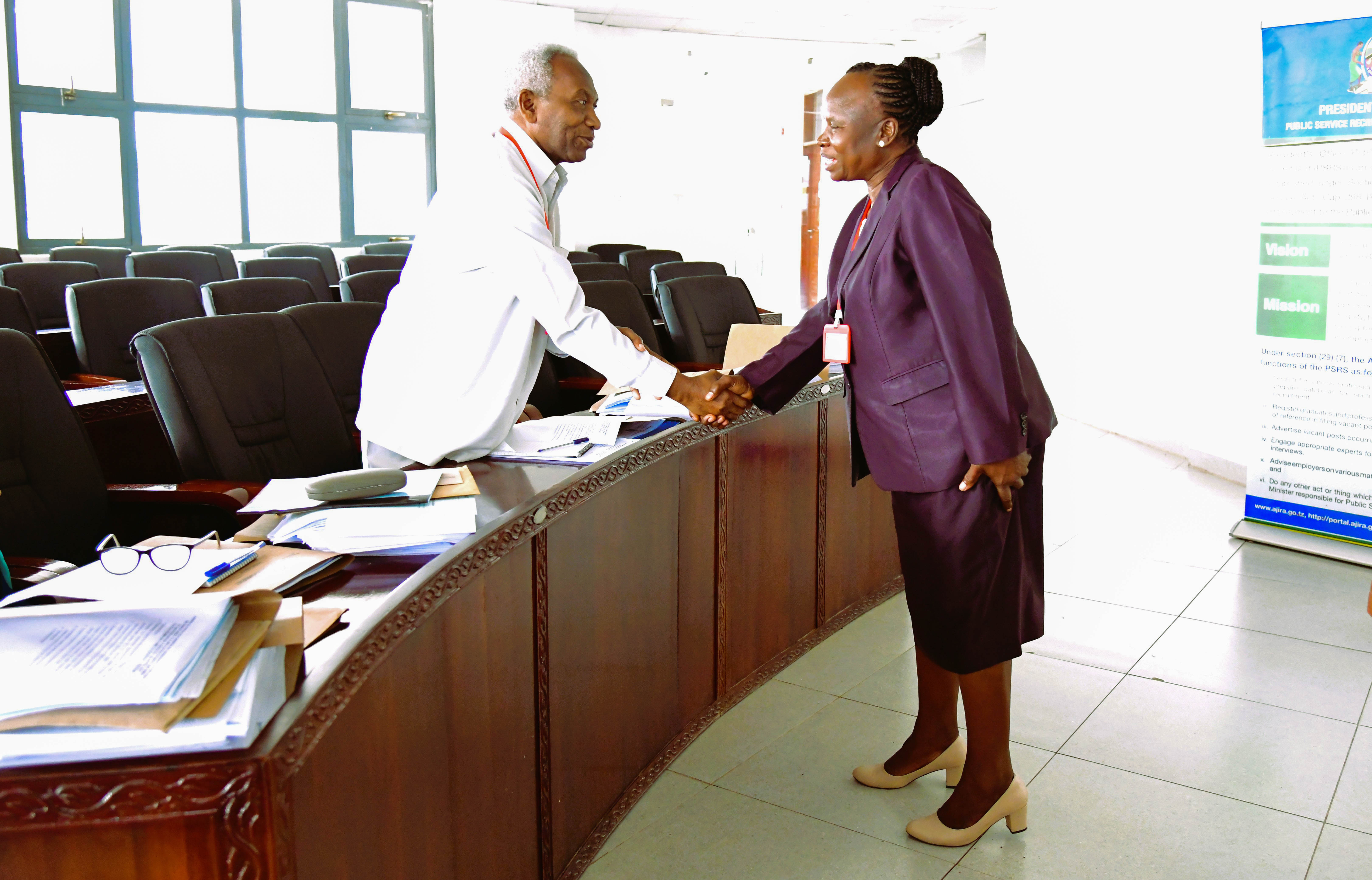 Mwenyekiti wa Sekretarieti ya Ajira katika Utumishi wa Umma Bi. Sophia Kaduma akimkaribisha Mjumbe mpya wa Sekretarieti ya Ajira Bw.Abdi Faki (Mwakilishi wa Zanzibar) kwenye kikao cha Wajumbe wa ofisi hiyo katika ukumbi wa Tume ya Uchaguzi jijini Dodoma